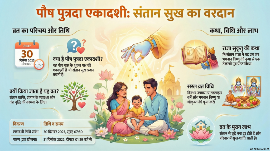 कहा जाता है कि तभी से जो भी भक्त श्रद्धा और विश्वास के साथ पौष पुत्रदा एकादशी का व्रत करता है, उसकी संतान से जुड़ी चिंताएँ दूर होती हैं और परिवार में सुख-शांति बनी रहती है।
